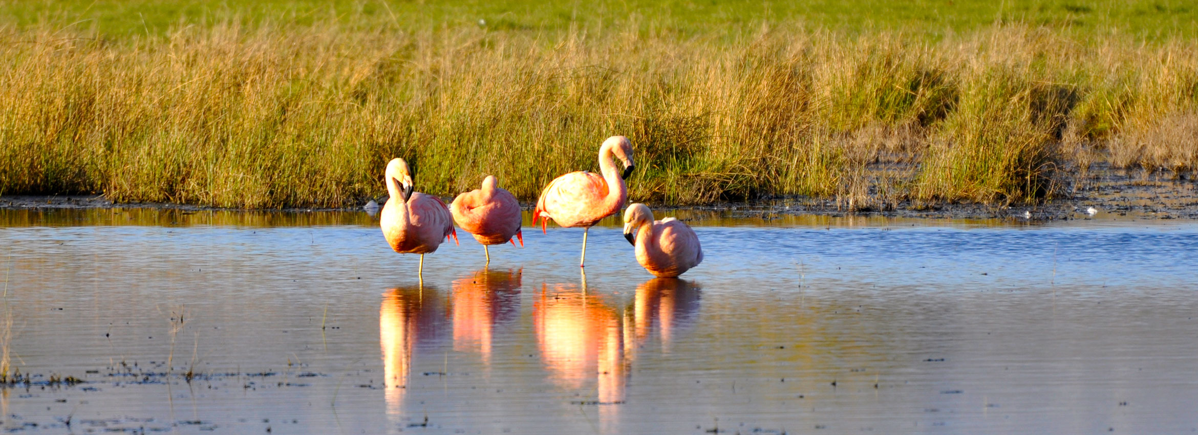Flamenco AustralEs posiblemente el más hermosos de las tres especies de flamencos que habitan en nuestro país y tiene su hábitat en lagunas y corrientes de agua dulce y salobre. El cuerpo es rosado, alas de color salmón fuerte, bordeadas de negro. Desata toda su belleza en vuelo. El pico es grueso, negro y curvado para peinar el fondo barroso. Se lo ve generalmente en bandadas bastante populosas.